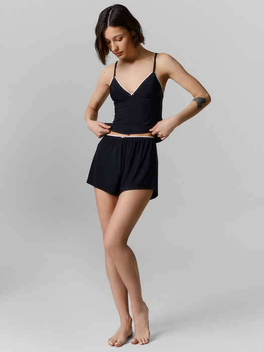Комплект женский состоит из блузы и шорт. Блуза прилегающего силуэта, на тонких бретелях. Горловина V-образной формы. По переду фигурный подрез под грудью, по лифу застрочены вытачки. Лиф на подкладке из основного полотна. Бретели выполнены из основного полотна с регулировкой на кольца и регуляторы (8мм пластик). По горловине и проймам притачана эластичная тесьмас зубом 11 мм (06/11) KTE11-11 (Arteks Е2510). Нижний срез обработан швом вподгибку. Шорты прямые, свободные. Посадка средняя. По верхнему срезу притачана эластичная тесьма с зубом 11 мм (06/11) KTE11-11 (Arteks Е2510). Нижний срез обработан швом вподгибку.