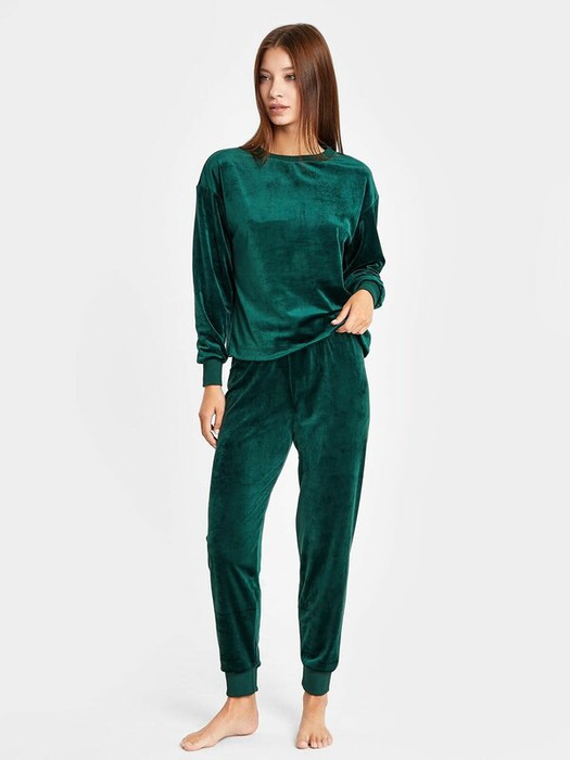 Уютный флисовый комплект. Состоит из лонгслива и брюк. Лонгслив длиной до середины ягодиц, прямого силуэта, с круглой горловиной, спущенной линией плеча и длинными рукавами на манжетах. Брюки длинные, зауженные к низу, с эластичным поясом, на манжетах. Комфорт и особая нежность!