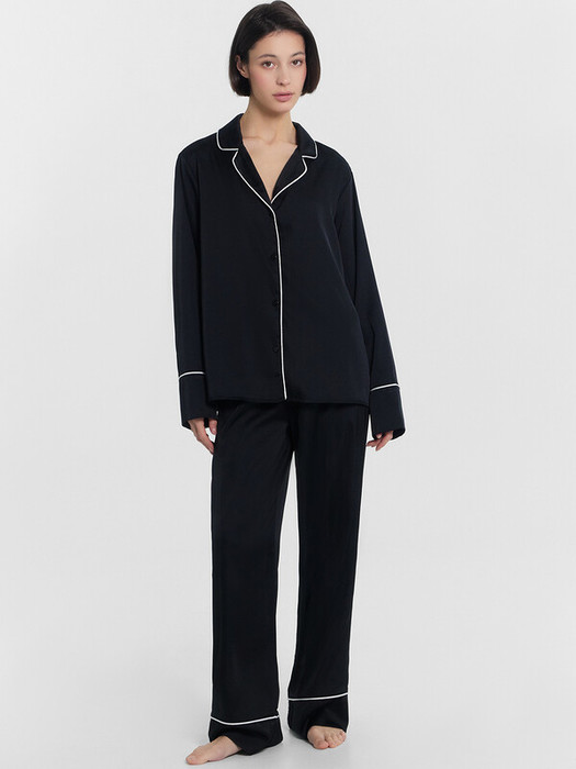 Эта женская пижама идеально подходит для создания элегантных домашних образов. Жакет прямого силуэта с отложным воротником и лацканами, украшенными кантом, придает изделию изысканный вид. Длинные рукава с манжетами, также декорированными кантом, добавляют элегантности и удобства. Жакет застегивается на пуговицы, а на передней части расположен карман. Брюки свободного силуэта с манжетами, украшенными кантом, обеспечивают комфорт и стиль. Изделие выполнено из спандекса, обладающего высокой степенью растяжимости, что делает одежду комфортной и позволяет ей сохранять форму даже после многочисленных стирок. Этот материал мягкий и приятный на ощупь, что делает его идеальным для одежды, предназначенной для длительного ношения. Пижама Mark Formelle станет отличным выбором для тех, кто ценит как комфорт, так и элегантность в домашней одежде.