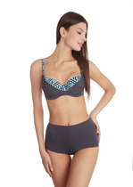 Бюстгальтер купальный бандо, со съемными бретелями. Лиф на подкладке, со съемными чашками-вкладышами (GNv-15m). Верхний и нижний срезы обработаны швом вподгибку с эластичной резиновой тесьмой внутри 10 мм. Съемные бретели из основного полотна с эл резиновой тесьмой 7 мм внутри, с регулировкой по длине. Регуляторы (2 шт) и застежки-крючки (4 шт) металлические с гальваническим покрытием. Бретели крепятся к бюстье черз петлю, заготовленную из парфюмерной ленты.