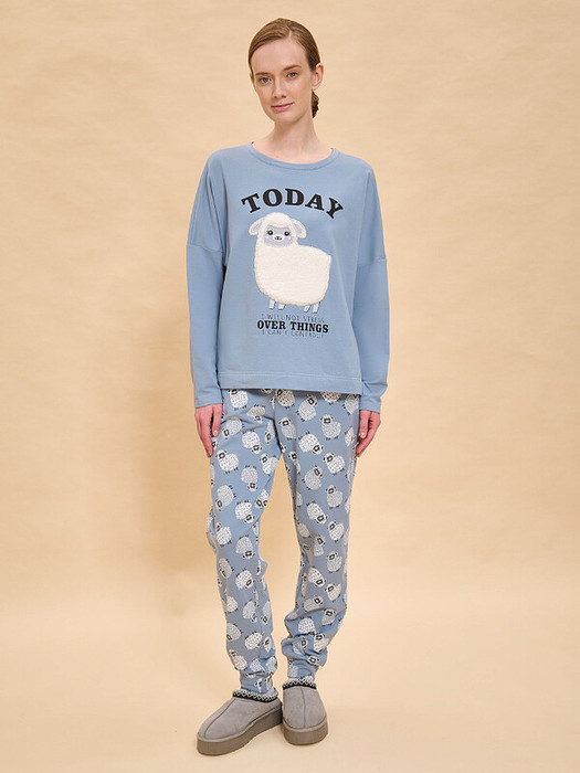 Костюм женский их футера с начесом: толстовка и брюки. Теплая, мягкая, приятная на ощупь ткань с 95% хлопка в составе – почти не мнется, сохраняет форму даже после частых стирок. Свободный крой толстовки и спущенное плечо – комфортный и модный оверсайз. Оригинальное решение - объемная нашивка из любимого тедди-флиса в виде милейшей овечки, которая перекликается с принтом на штанах. Большой объем брюк в области бедер и сужение книзу за счет манжетов из основной ткани делают брюки удобными в носке. Домашний утепленный комплект отлично подходит на осенне-зимний сезон, а также согреет на природе прохладными летними вечерами.