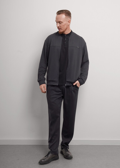 Брюки прямые зауженные к низу, выполнены из трикотажного жаккардового полотна с комфортным поясом на завязках (шнуре). Функциональности модели придают боковые вместительные карманы. Брюки эргономичные и удобные.