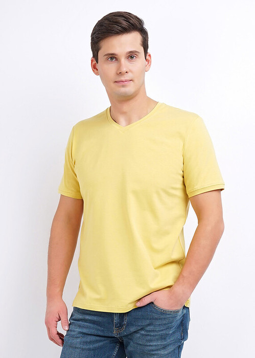 Базовая однотонная футболка стандартного объема с V вырезом горловины, втачным рукавом из хлопкового полотна с добавлением эластана. Является неотъемлемой частью мужского гардероба.