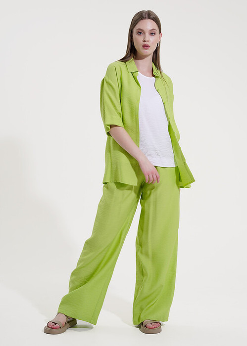 Комплект из текстильного полотна штапель-креп. Блузка свободного кроя. Втачной рукав. Отложной воротник спереди планка на пуговицах,накладной карман.Боковые разрезы.Брюки широкие. По талии пояс на резинке,с завязками. Боковые карманы в отрезном бочке.