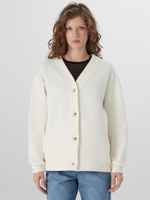 Женский кардиган — это нежный акцент для прохладных дней. Он выполнен из мягкого селаника — трикотажа с лёгким ворсом, который сохраняет тепло и приятно облегает тело. Свободный прямой силуэт со спущенным плечом и V-образной горловиной создаёт элегантный и расслабленный вид.