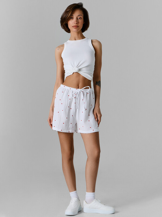 Шорты свободные, короткие из ткани. Посадка средняя. Пояс цельнокроеный с эластичной тесьмой внутри (внутр. 20мм 20RV). С внешней стороны пояса пробиты петли и вставлен шнур-бейка из основного полотна. Нижние срезы шорт обработаны швом вподгибку с закрытым срезом.