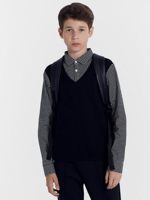 Стильный джемпер прямого силуэта для мальчиков. Вырез V-образной формы, с декоративной текстильной манишкой на пуговицах и воротником-стойкой. Рукава с манжетами и застежкой на пуговицу. Джемпер имитирует рубашку, поддетую под жилет, и отлично подходит для школы!