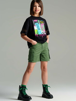 Шорты карго прямого силуэта из текстильного полотна. Посадка средняя. Длина выше колена. Пояс цельнокроеный  с эластичной тесьмой и шнуром внутри. По поясу выполнены три декоративные строчки. На передних деталях брюк настрочен один карман с клапаном, обработаны карманы с наклонным входом от боковых швов. Низ изделия обработан швом в подгибку.