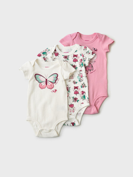 Комплект из трёх мягких боди для новорождённой девочки. Все модели с коротким рукавом и удобной застежкой на кнопки снизу, что облегчает переодевание. Два ряда кнопок, боди растет вместе малышом. Первое боди молочного цвета украшено крупной бабочкой и надписью. Второе – розовое с принтом милой феи и бабочек. Третье боди имеет яркий и насыщенный принт по всей поверхности – девочки-цветы, цветы и бабочки. Материал приятный к телу, из дышащего хлопкового трикотажа. Все детали аккуратно обработаны – горловина, рукава и низ изделия выполнены с окантовкой и отстрочкой.