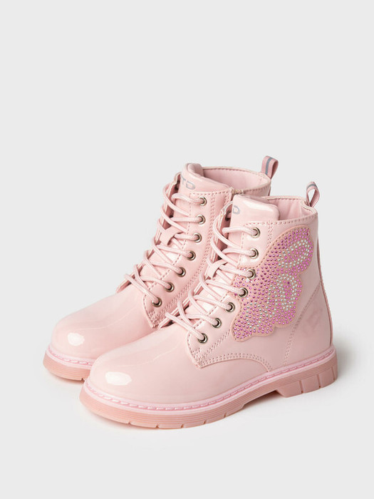 Трендовые розовые детские ботинки для девочки на шнурках.  Изнутри имеется молния. Ботинки выполнены из лаковой искусственной кожи. Сбоку ботинки декорированы деталью в виде крыла бабочки, украшенной стразами и заклепками. В обуви стоит мягкая флисовая подкладка. Флисовая  стелька вынимается для просушки. Формоустойчивый задник поддерживает стопу в правильном положении. Эргономичная форма колодки обеспечивает правильное формирование стопы ребенка. Подошва из ТПР не скользит и устойчива к истиранию. Подошва с мигающим элементом flashlight.