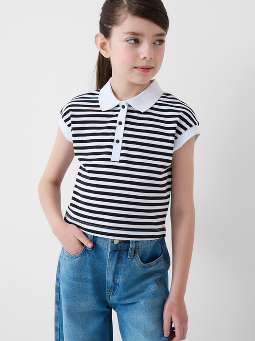 Укороченная футболка-поло в полоску для девочки подростка. Модель прямого кроя, с коротким рукавом, выполненная из хлопкового трикотажа пике. Спереди — застежка на три кнопки. Длина изделия укороченная — до уровня талии.