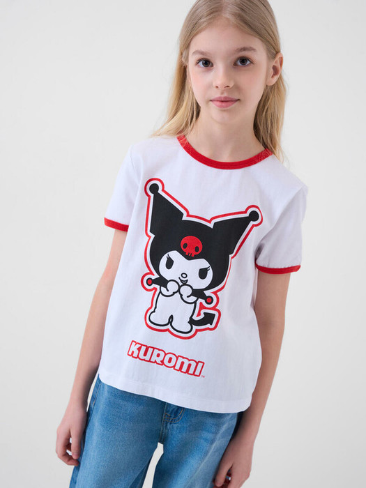 Футболка для девочки подростка. Модель прямого кроя, выполнена из эластичного хлопкового трикотажа джерси. На груди расположен крупный принт с любимым персонажем Куроми.