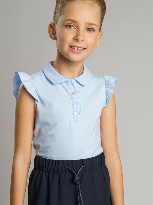 Футболка-поло с рукавами "крылышки" из плотного фактурного трикотажного полотна с добавлением эластана для комфорта в носке. Шов горловины декорирован изящной тесьмой с люрексом. Планка с застежкой на пуговицы, декорирована рюшей.