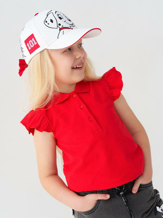 Стильная детская бейсболка для девочки. Выполнена из белой хлопковой ткани с насыщенным принтом с любимыми мультяшными героями - далматинцами. У бейсболки изогнутый козырек, классическая форма. Особое внимание привлекает большой красный бантик-резинка на задней части — он делает изделие особенно нарядным.