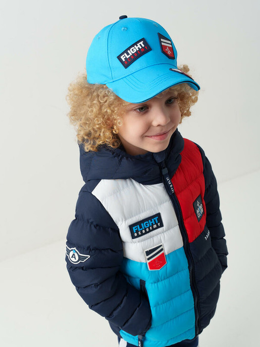 Детская бейсболка из хлопка для мальчика. Изделие выполнено с эффектными декоративными нашивками на передней части и козырьке: шеврон с самолётом, надпись и логотип в стиле авиации.