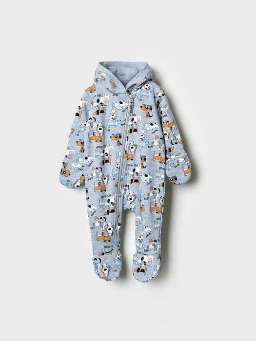 Детский комбинезон для новорожденного мальчика. Модель из мягкого, хлопкового трикотажа. Комбинезон с весёлым принтом – на ткани изображены мультяшные собачки и надписи. Капюшон, длинные рукавички и закрытые ножки - хорошо защищают малыша от прохлады. Молния расположена асимметрично – от капюшона до шва между ножками, что удобно при переодевании. Внутри есть мягкая подкладка.