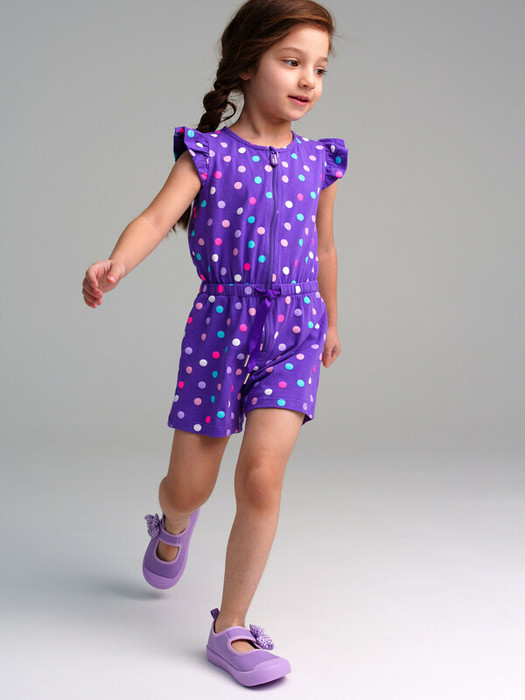 Комбинезон из качественного и приятного на ощупь трикотажа джерси. Высокое содержание хлопка 95%. Благодаря наличию эластана в составе ткани изделие проще в уходе и держит форму. Рукава-крылышки. Застежка на молнию. По талии эластичный пояс со шнурком.