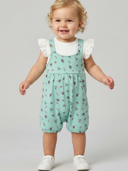 Детский комплект для девочки. Состоит из мягкой трикотажной футболки и полукомбинезона. Футболка имеет аккуратные короткие рукава с рюшами и удобные кнопки на плече, благодаря которым изделие легко надевать и снимать. Полукомбинезон выполнен из трикотажа с нежным цветочным принтом, с бретелями на кнопках и мягкой резинкой по низу штанин для комфортной посадки.
