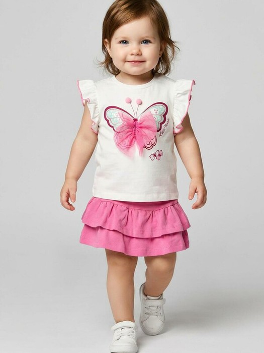 Легкий детский комплект для девочки. Выполнен из мягкого хлопкового трикотажа джерси, состоящий из футболки и юбки-шорт. Футболка прямого кроя с нежным принтом и декором из сетки. На плече застежка на кнопки для удобного переодевания. Рукава-крылышки. Пышная юбка на резинке с воланами, внутри имеет удобные шорты, что делает модель практичной для активного отдыха.