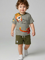 Детский костюм для мальчика. Состоит из футболки и шорт. Выполнен из хлопкового трикотажа. Футболка прямого кроя, с коротким рукавом. На плече застежка на кнопки для удобного переодевания. Яркий принт и нашивки. Шорты свободные, с эластичным поясом и шнурком для регулировки посадки. По бокам расположены карманы.