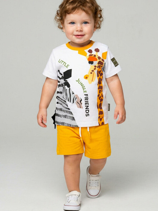Детский костюм для мальчика. Состоит из футболки и шорт. Выполнен из хлопкового трикотажа. Футболка прямого кроя, с коротким рукавом. На плече застежка на кнопки для удобного переодевания. Яркий принт с милыми животными и нашивка. Декоративная бахрома, имитирующая гриву зебры. Шорты свободные, с эластичным поясом и шнурком для регулировки посадки. По бокам расположены карманы.