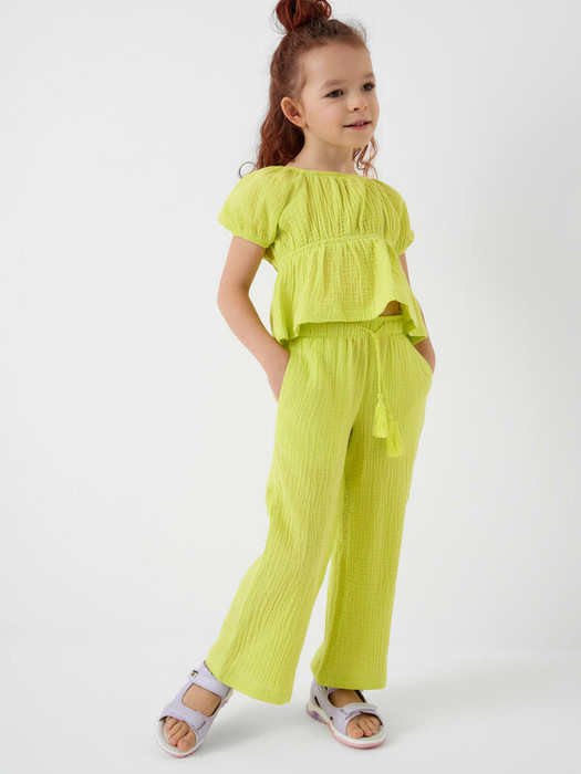 Легкий летний детский комплект для девочки. Состоит из укороченной блузки и широких брюк. Материал – мягкий хлопковый муслин, дышащий и приятный к телу. Блузка с пышными короткими рукавами и сборкой на резинке по талии, что создает аккуратную и женственную форму. Брюки – длинные и свободные, с высокой посадкой и резинкой на поясе. По бокам — удобные карманы.