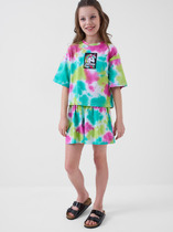 Детский легкий комплект для девочки. Состоит из футболки и прямых брюк на резинке. Выполнен из хлопкового трикотажа. Футболка свободная, с округлым вырезом и мягкой сборкой по горловине и низу, за счёт чего выглядит воздушной и комфортной. Брюки на резинке — прямые, со средней посадкой.