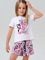 Легкий детский комплект для девочки. Выполнен из мягкого хлопкового трикотажа джерси, состоящий из укороченной футболки и юбки-шорт. Футболка свободного кроя с ярким принтом. Пышная юбка на резинке с воланами, внутри имеет удобные шорты, что делает модель практичной для активного отдыха.