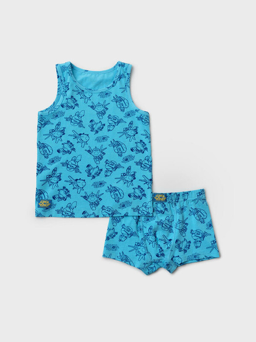 Детский комплект для мальчика, состоящий из майки и трусов-боксеров. Майка без рукавов, с классической круглой горловиной и ярким принтом с героями мультфильма "Super Wings".  Пояс трусов выполнен из эластичной тесьмы для удобной посадки. Комплект выполнен из приятного хлопкового трикотажа.