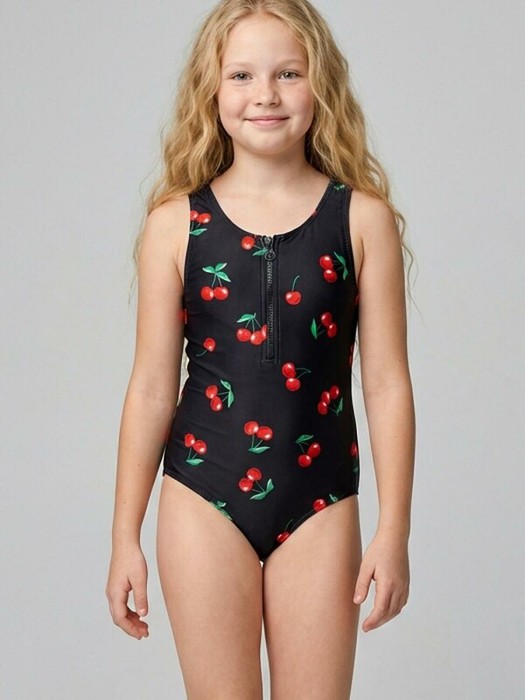 Слитный купальник для девочки подростка. Выполнен из эластичного черного материала с ярким принтом в виде вишен.  Спереди расположена короткая молния, облегчающая надевание. Все края обработаны эластичной тесьмой, чтобы изделие хорошо сидело на теле и не натирало. Внутри передняя часть продублирована подкладкой, а для старших размеров с 140 по 170 предусмотрены съемные чашечки. лагодаря UF-защите, ткань сохраняет первоначальный вид даже при длительном пребывании на солнце. Купальник отлично садится по фигуре и подходит для активного отдыха и плавания.