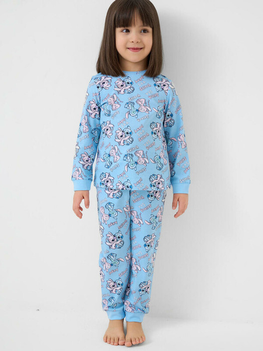 Детская пижама для девочки. Комплект из лонгслива, прямого кроя с длинными рукавами и брюк. Изделие выполнено из мягкого, хлопкового трикотажного материала и украшено ярким принтом с героями мультфильма Лило и Стич. У лонгслива круглая горловина и манжеты на рукавах, у брюк — удобный пояс на резинке, дополненный декоративным белым шнурком. Манжеты по низу брюк делают модель комфортной в носке.