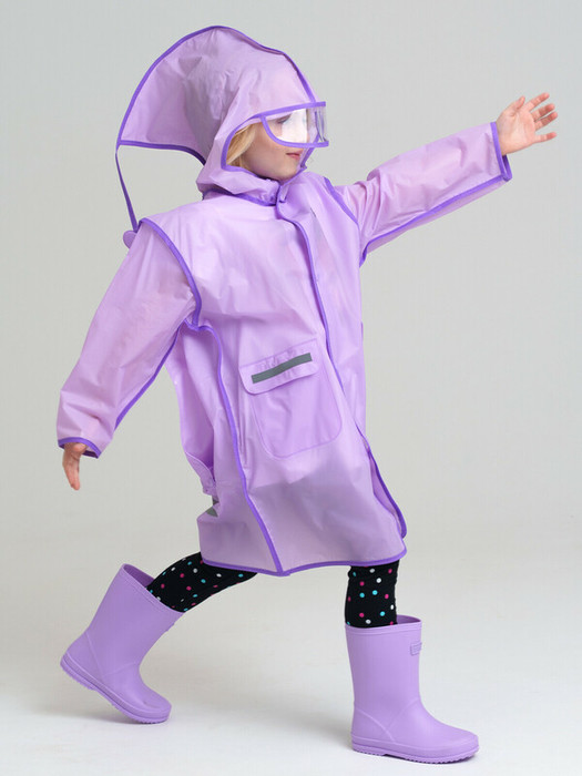 Дождевик детский с козырьком с KUROMI для девочки. Застежка на кнопки. Материал ЭВА. Без подкладки. Модель имеет спереди два накладных кармана с клапаном. Сзади имеется объемный клапан на кнопках для изменения объема плаща под рюкзак. Есть светоотражающие элементы спереди и сзади. Добавлена петелька под капюшоном с внешней стороны, чтобы остальные вещи на вешалке не намокали. Модель идеально  сочетается с резиновым сапогам и зонтом из коллекции. В комплекте идет непромокаемая сумочка.