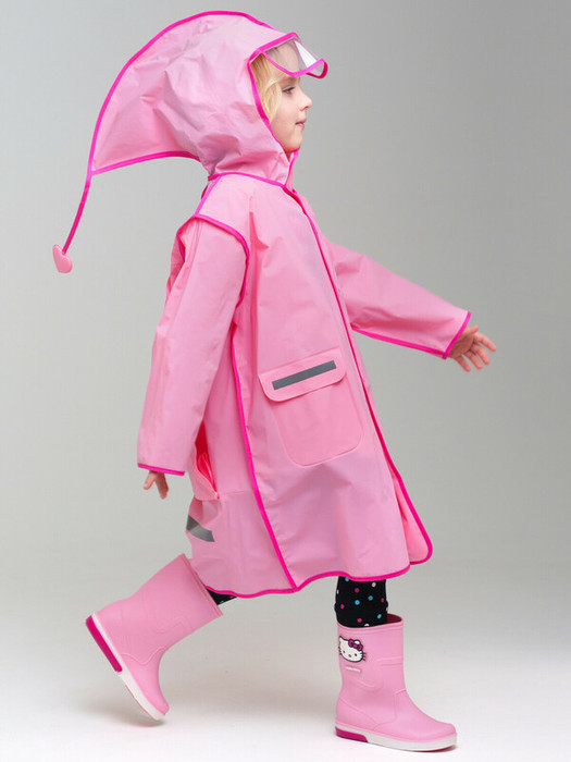 Дождевик детский с козырьком с HELLO KITTY для девочки. Застежка на кнопки. Материал ЭВА. Без подкладки. Модель имеет спереди два накладных кармана с клапаном. Сзади имеется объемный клапан на кнопках для изменения объема плаща под рюкзак. Есть светоотражающие элементы спереди и сзади. Добавлена петелька под капюшоном с внешней стороны, чтобы остальные вещи на вешалке не намокали. Модель идеально  сочетается с резиновым сапогам и зонтом из коллекции. В комплекте идет непромокаемая сумочка.