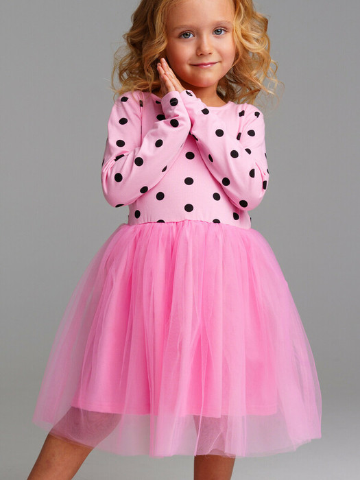 Платье трикотажное с юбкой из мягкой сетки. Верх платья из трикотажа с высоким содержанием хлопка 95%. Благодаря наличию 5% эластана в составе ткани изделие держит форму.