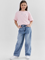 Детский джинсовый полукомбинезон для девочки. Модель на широких лямках, которые перекрещиваются на спине и застёгиваются на кнопки. По бокам и на лямках – розовые металлические кнопки. На груди — яркая аппликация в виде бабочки. Удобная посадка за счёт эластичной вставки на поясе. Спереди боковые карманы, сзади — накладные. Брючины собраны на резинку, что делает посадку комфортной.