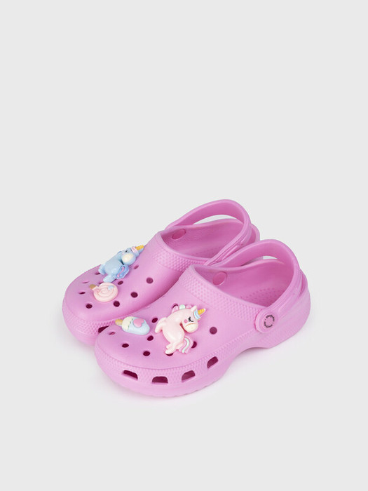 Сабо детские для девочки. Сабо из облегченного и прочного ЭВА. Материал хорошо моется. Модель украшена джибицами единорогами. Форма модели учитывает эргономику стопы. Модель имеет перекидной ремешок для лучшей фиксации обуви на ноге.  Благодаря вентиляционным отверстиям сабо проветриваются, ноги ребенка дышат и не потеют.