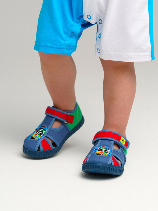 Сандалии из дышащего текстиля. Ремень с липучкой позволяет легко обувать сандалии. Подкладка выполнена из 100% хлопка. Стелька выполнена из натуральной кожи и имеет анатомический элемент для поддержания свода стопы. Подошва из ПВХ легкая  и гибкая.