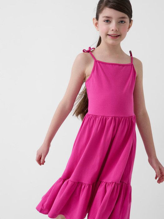 Лёгкий сарафан для девочки подростка. Модель из хлопкового трикотажа джерси, свободного кроя, длиной до колена, с ярусной юбкой на сборке, что добавляет объёма и легкости. Лиф с тонкими лямками, которые завязываются на плечах, создавая нежный акцент. На талии вшита силиконовая лента для лучшей посадки по фигуре.