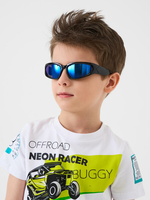 Солнцезащитные очки футуристической формы в стиле Y3K для мальчика подростка. Гибкая пластиковая конструкция мягко облегает лицо, не сдавливая его,и обеспечивают плотную посадку даже во время самых активных занятий ребенка. Солнцезащитные очки с фильтром Cat3.  Темные синие линзы имеют защиту UV400, которая отражает 100% ультрафиолетовых лучей с длиной волны менее 400 нанометров, эффективно блокируя все ультрафиолетовые лучи при солнечном свете. Небьющиеся линзы из триацетата целлюлозы устойчивы к царапинам. Ширина оправы - 130 мм, длина дужки - 108 мм. Обхват головы 50-52 см. Такие очки эффективны для защиты глаз в тропиках, у моря и в горах. Очки транспортируются в картонной коробке. В комплект входит фирменный текстильный чехол из микрофибры, с помощью которого легко ухаживать за изделием. Очки транспортируются в картонной коробке.