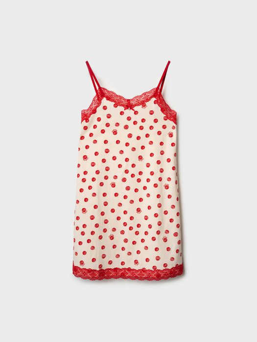 Ночная сорочка для девочки подростка. Выполнена из мягкого хлопкового трикотажа с добавлением эластана, за счёт чего она тянется и комфортно сидит. Модель на тонких регулируемых бретельках и украшена кружевом по вырезу и внизу. Спереди — аккуратный бантик. Ткань украшена весёлым принтом в виде красных горошин и клубничек на молочном фоне.