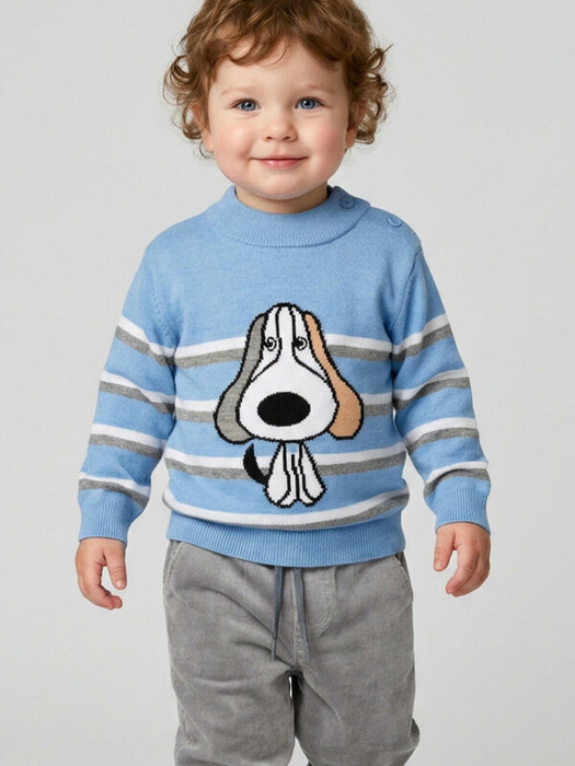 Детский свитер для мальчика. Выполнен из мягкого вязаного трикотажа. Спереди украшен крупным принтом собаки. У свитера круглая горловина с застежкой на кнопках на плече, что удобно для переодевания малыша. Манжеты, низ изделия и горловина связаны резинкой, обеспечивающей хорошее прилегание.