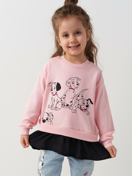 Детский свитшот для девочки. Выполнен из хлопкового футера без начеса. Спереди - принт с любимыми мультяшными героями из "101 далматинец". На спинке размещён крупный текст. Особенность модели — декоративная "юбка", пришитая по нижнему краю, которая создаёт эффект платья. Горловина, манжеты и низ изделия собраны на эластичную резинку.