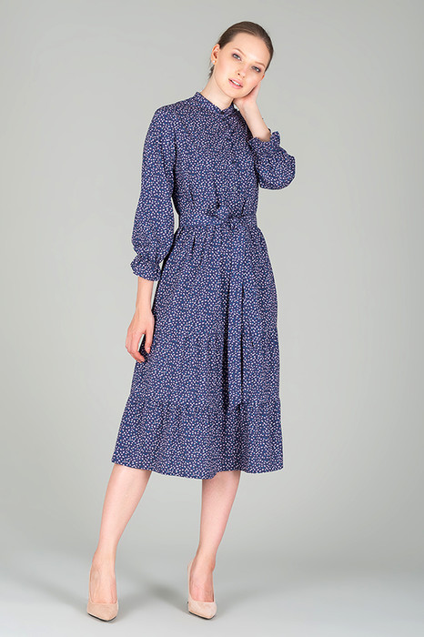 Платье свободного силуэта из струящейся плательной ткани. Изделие отрезное по линии талии, со сборкой на юбке. Лиф с застёжкой на пуговицы. Вырез горловины обработан воротником-стойкой. Втачной рукав в романтическом стиле, присборен на резинку. В комплекте пояс из основной ткани.
