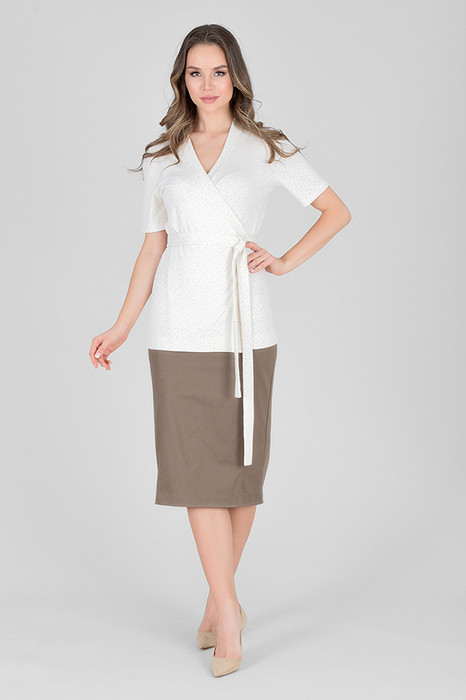 Костюм из юбки и кардигана. Юбка прилегающего силуэта из эластичного денима. На передней части изделия выполнены рельефы. Сзади по среднему шву застёжка-молния, снизу разрез. Пояс притачной. Кардиган из фактурного эластичного полотна. Полуприлегающий силуэт с запахом. Короткий втачной рукав. Вырез горловины оформлены бейкой из основной ткани, переходящий в пояс.