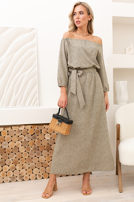 Платье свободного силуэта с открытыми плечами из плательной ткани. Линия плеч, линия талии и низ рукава присборены на резинку. Рукав реглан 3/4. В комплекте пояс из основной ткани.