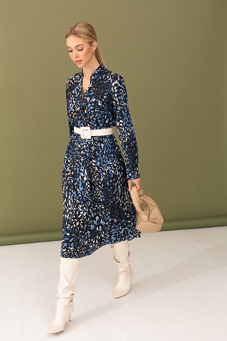 Платье свободного силуэта из плательной ткани. Изделие отрезное по линии талии с резинкой. Лиф платья с запахом, фиксируется на пуговицу для удобства. На передней части юбки выполнена складка, имитирующая запах, в боковых швах карманы. Линия горловины оформлена воротником-стойкой. Втачной длинный рукав с манжетой, застегивающейся на пуговицу. В комплекте пояс из основной ткани.