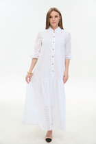 Платье из вискозной ткани с крэш-эффектом. Свободный силуэт, с разрезом в боковом шве. По центру передней и задней части изделия выполнен шов. Цельнокроеная стойка, переходящая в V-образный вырез горловины, визуально делает фигуру стройнее. Цельнокроеный короткий рукав. В комплекте пояс из основной ткани.