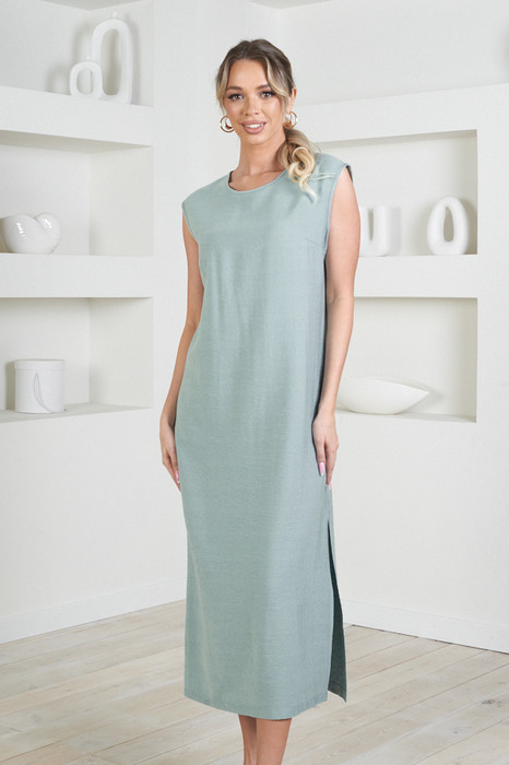 Платье из вискозной ткани с крэш-эффектом. Полуприлегающий силуэт, с разрезом в боковом шве. По среднему шву спинки застёжка на петлю-пуговицу. Круглый вырез горловины и линия проймы окантованы косыми бейками из основной ткани.