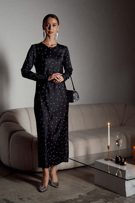 Платье прилегающего силуэта из плательной ткани. Крой платья по косой. Втачной длинный рукав. Круглый вырез горловины, сзади застёжка на петлю-пуговицу.