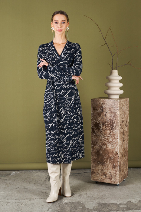 Платье прямого силуэта из мягкого эластичного полотна. Глубокий V-образный вырез горловины плавно переходит в запах, фиксируется притачным поясом. Втачной длинный рукав.